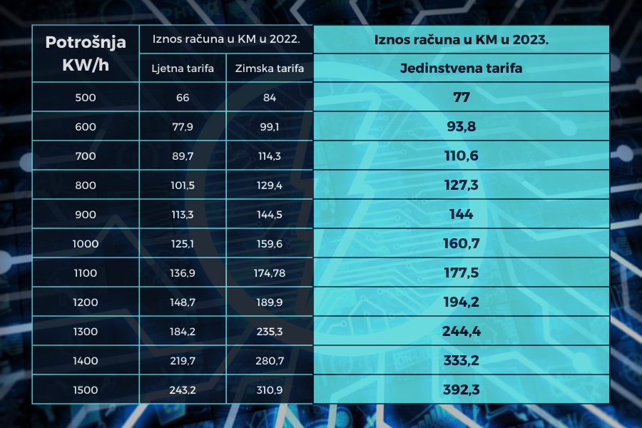 Уколико би се гледала просјечна цијена љетне и зимске тарифе то би значило да ће рачуни за потрошених 500 киловата идуће године бити већи за двије КМ.