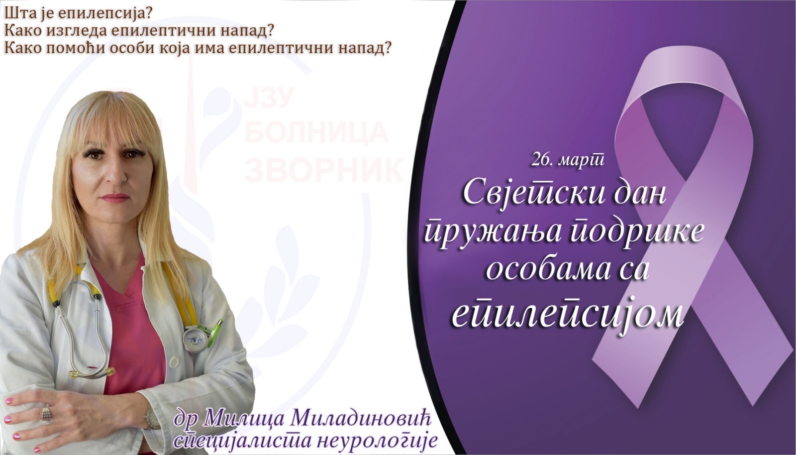 У сврху подизања нивоа свијести о епилепсији и пружања подршке Удружењу обољелих од епилепсије Републике Српске у зворничкој болници су урадили интервју са др Милицом Миладиновић, специјалистом неурологије Одјељења за неурологију у овој здравственој установи, која је дала одговоре на нека од кључних питања која треба да знамо о епилепсији. Интервју преносимо у цјелости.
