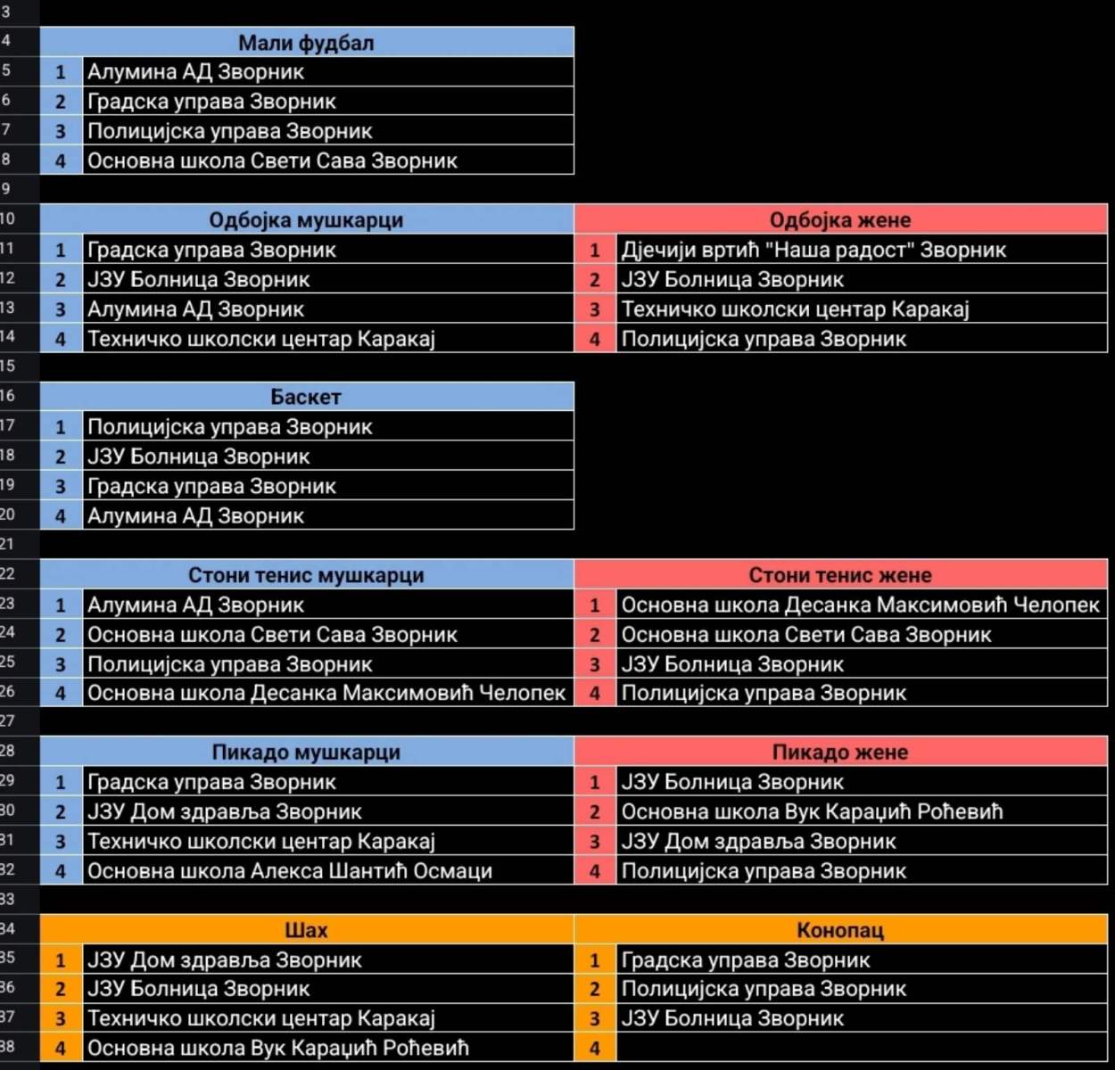 Резултате по спортовима погледајте на фотографији испод текста.